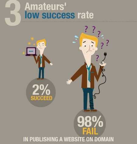 3. 业余的Web设计师的成功率较低。如果以在新的域名上发布一个网站为评判标准的话,那么只有2%的业余开发者取得了成功,而98%都是失败的,这样的结果显然是很难让人接受。