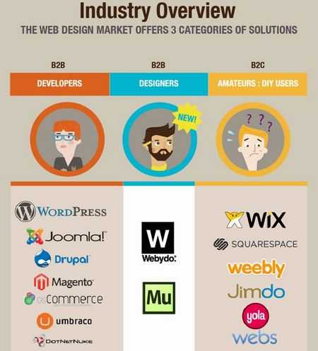 - 以业余设计师为主的B2C方案,其依靠的核心工具包括:Wix、Squarespace、Weebly、Jimdo、yola、webs等等。
