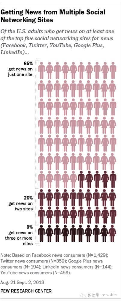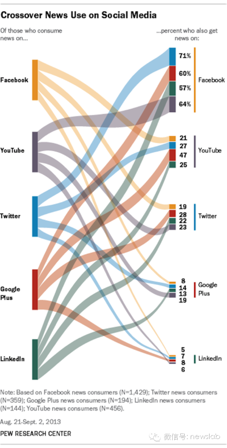 在社交媒体平台上,新闻读者有多大比例是互相重叠的呢?皮尤研究中心调查了五大社交网站(Facebook、Twitter、Youtube、Linkedin、Google+),调查发现65%的新闻用户仅使用其中之一(85%为Facebook,占据绝大多数),大约四分之一(26%)同时使用两个社交网络获取新闻,其中71%的Twitter新闻读者也是Facebook的新闻读者。而9%的用户使用三个或三个以上。详见以下两张图。