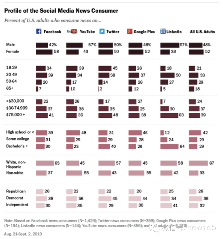 而在收入和教育水平上,Linkedin的用户比例最高。在种族和政治倾向上,非白人(非洲裔、拉丁裔、亚裔等人群)使用社交网络获取新闻高于白人在其各自总人数的比例;支持民主党或独立政治倾向的使用社交网络获取新闻用户高于支持共和党在其各自总人数的比例。