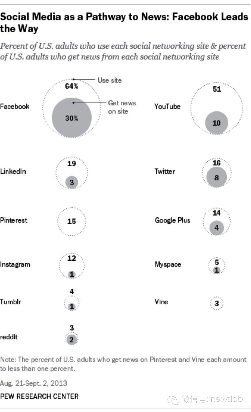 今年11月中旬,皮尤研究中心发布了美国成年人使用各大社交网络网站消费新闻情况的对比数据。数据显示,全球最大的社交网络Facebook在美国也是第一大新闻阅读网络。64%的美国成年人每月访问该网站,其中有一半(30%)通过Facebook获取新闻。