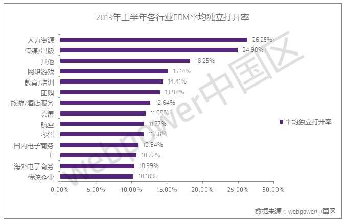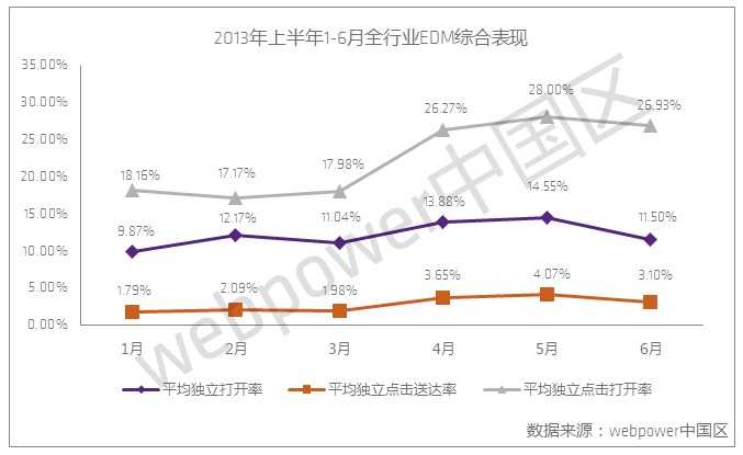 webpower于近日发布中国地区邮件营销行业数据报告,数据显示,2013年上半年国内全行业EDM平均送达率为94.26%,平均独立打开率为12.30%,平均独立点击打开率为23.42%,平均独立点击送达率为2.88%。2013年上半年中国邮件营销行业继续保持平稳中上升的趋势。