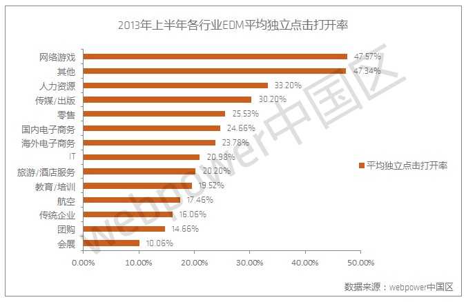 2013年上半年,邮件营销应用主要集中在国内电子商务、海外电子商务、团购、旅游/酒店服务、人力资源、传媒/出版、教育/培训、会展等十三大领域。人力资源行业的各项EDM指标值在2012年的基础上继续表现突出,平均独立打开率为26.25%,平均独立点击打开率为33.20%,平均独立点击送达率为8.71%。传媒/出版行业在2013年上半年,各项EDM指标也较2012年度均有较大提升,平均独立打开率为24.90%,平均独立点击打开率为30.20%,平均独立点击送达率为7.52%。而网络游戏行业,除了一直以来的高平均独立点击打开率(47.57%),在平均独立打开率(15.14%)和平均独立点击送达率(7.20%)上,相比其2012年度也均有显著增长。
