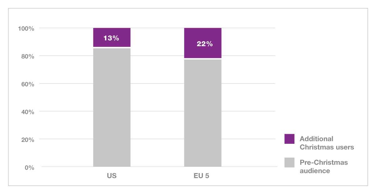 • 在节日季,购买新移动设备的西方消费者数量比全年其他任何时候都多。为了了解这一增长多么快,我们针对美国市场及欧洲五国的用户(包括英国、法国、德国、西班牙和意大利)进行了一次专门的分析,我们看到从平安夜到圣诞节后之间这三天内,有多少新的iOS和Android用户增加。