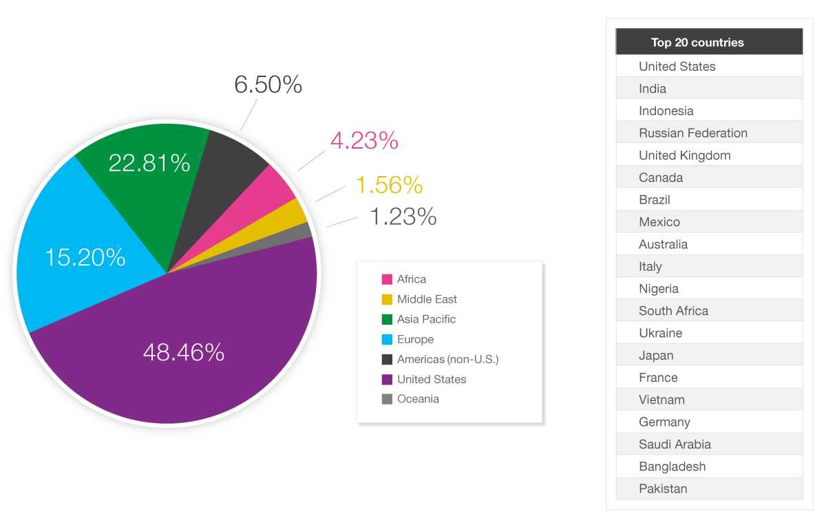 • 墨西哥一直排在全球流量排行的前20位,但是,今年我们观察到巴西在排行榜上的位置出现了显著提升。它2012年首次出现在排行榜,2013年在排行榜上最终超越了墨西哥。其他的南美国家同样也出现快速增长。