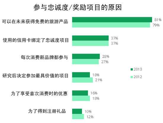 几乎所有(96%)的富裕旅客都参与忠诚度了项目,较2012年上升两个百分点。如果他们是某家旅游企业忠诚度项目会员,那么现在他们比之前更倾向于预订这些企业的机票、酒店、租车产品和OTA产品。