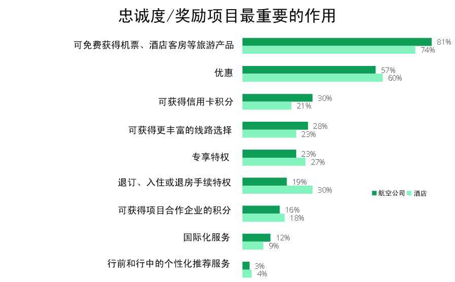 下面的图表展示了富裕旅客认为他们能从航空公司或酒店忠诚度项目所获得的的各种好处: