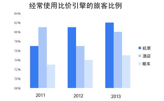 他们仍旧会使用比价引擎来比较旅游中的所有产品,尤其是酒店。在三大领域——机票、酒店和租车产品市场,2013年的比价行为相较2012年更为活跃。