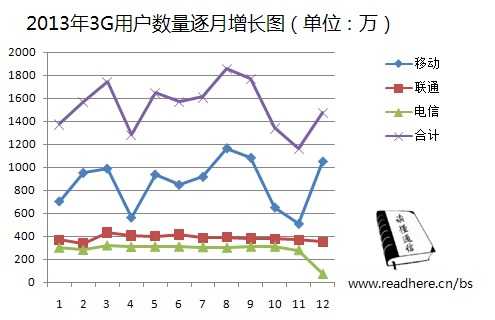 下图展示了2013年各个月的3G用户数量增长情况,可见中国移动决定了3G用户的增长趋势。