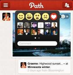 良好的用户体验并非仅仅指用户界面,但是界面确实对产品有很大的帮助。今天我打开Path并简单的试用了一下。在Path上,如果你喜欢某个图片或是其它什么,你可以点击右上角的笑脸图标(如图)。当然,如果你是真的非常喜欢这个图片,那么可以选择心形图标。另外还有三个:一个闪闪的脸,惊讶的脸和悲伤的脸。由此可见,Path使用了5个不同类型的图标来表示“喜欢”,精巧而形象。类似的功能,在Facebook中,仅仅只有“喜欢”和“不喜欢”两个选项。