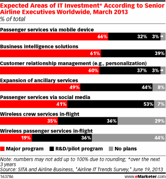 199IT编译,航空业通过数字渠道向消费者直接售卖机票和辅助产品的行动使其在增加收入上存在巨大潜力。尤其是移动和机上媒体,这是非常有潜力的平台,虽然航空业想要挖掘此方面的机遇,但这不等于说他们就能成功。技术障碍和消费者的怀疑态度是航空业面对的最大困难,根据eMarketer的最新报告《航空业的数字策略:移动设备和机上媒体带来收益机遇》。