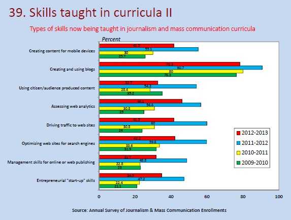 目前在美国新闻传播课程中传授的技能包括:在网上使用视频、图像(静态展示和幻灯片动态展示),通过网站来进行新闻报道和公关活动,为网站编辑、写作、进行广告推广以及设计布局,为移动设备创作内容,使用博客和社交媒体,管理在线出版,甚至是创业等。