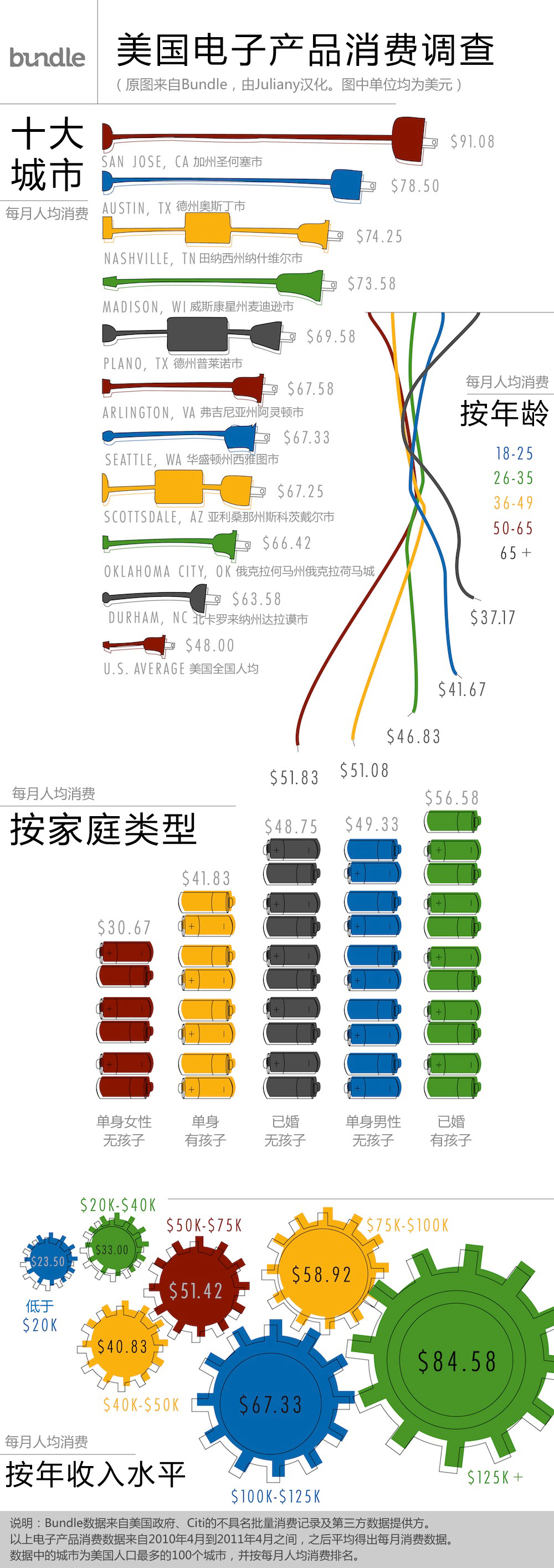 根据美国政府、银行和其它第三方的批量匿名数据,Bundle按城市、年龄、家庭类型和收入水平分析了美国人在电子产品上的消费情况。有些结果在预期之中(比如随着家庭成员的增加,月均电子产品支出额也相应提高),但有些结论则不大符合人们的想象。比如,威斯康星州的麦迪逊市的月人均支出就压过了华盛顿州的西雅图市,以及50到65岁人群在这方面比年轻人花费更多。