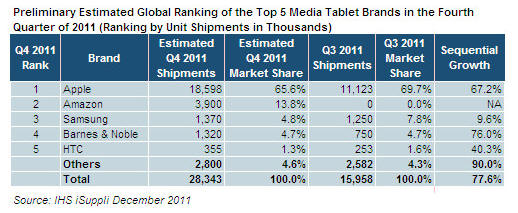 来自市场研究公司iSuppli的预计,亚马逊今年推出的平板电脑Kindle Fire在2011年第四季度的全球出货量将达到390万台。这个数字大约是苹果iPad系列平板电脑同期出货量的21%。整体上,2011年第四季度,全球平板电脑的出货量将达到2834.3万台。