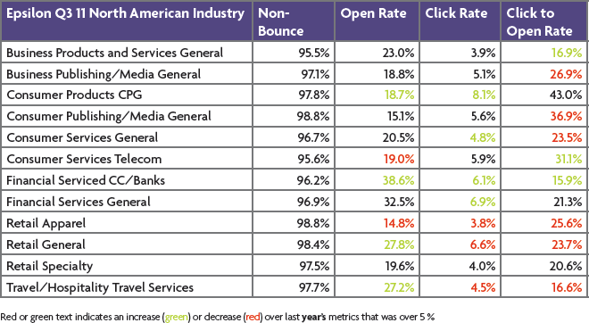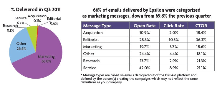 邮件营销服务公司Epsilon发布了2011年Q3的邮件营销趋势和行业基准研究报告,该报告根据该公司发送的邮件数据进行挖掘后整理而成,为从事邮件营销的广告主提供一些参考。