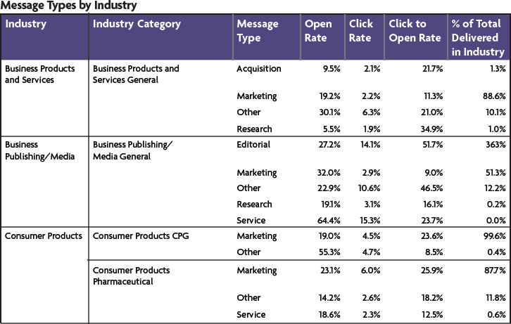 下面是不同行业发送的不同邮件营销内容情况