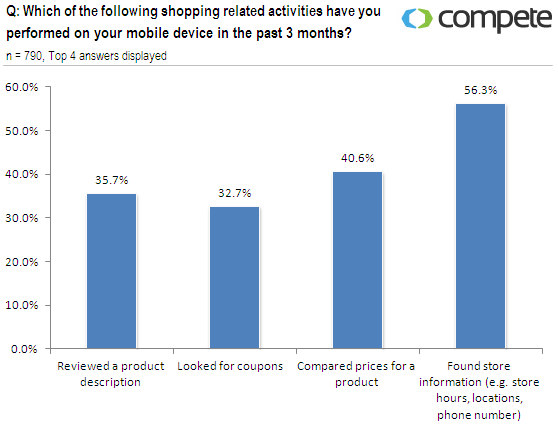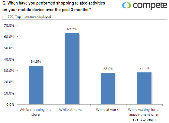 Compete:移动购物的场景多发生在家中,用户以查找商店为主 来自Compete的数据显示,移动购物最大的比重不是来自店面或路上,而是发生在家里。 63.2%的和购物相关的活动发生在家中,34.5%的用户在商店使用他们的移动设备(比价、看评论,下载优惠券),28.6%的用户在消磨时间时会购物。 下面是和购物相关的一些活动,我们可以发现查找和商店相关的信息是做多的,然后是比价,以及寻找优惠券。这些都告诉品牌,用户在找你们。 更多阅读:Compete:社交的未来在移动Compete:智能手机用户男女行为差异Compete:二维码生成网站流量走低,二维码营销遇到困局Compete:推特及其对购物的影响Compete:世界末日分析Compete:2009年6月-2011年6月美国黄色网站流量数据Compete:在线购买商品前参考哪些信息渠道?compete:美国主要四家在线零售商消费电子产品销量和销售额份额compete:位置关键词营销是租房网站成功关键 Four Seasons:奢侈品品牌营销之道Compete:2011年7月25-44岁人群是美国三大问答网站主要用户Compete:解构Pinterest的影响力compete:2012年4月美国搜索引擎市场排名Compete:互联网长尾之谜,我们花在TOP10网站上的时间比过去更多了compete:维基百科40%的流量来自35-54岁的用户