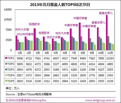 2013年综艺节目逐渐呈现出版权引进的季播式综艺节目数量全面超过卫视原创综艺,其网络收视一改一家独大的局面,遍地开花。