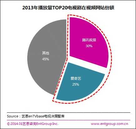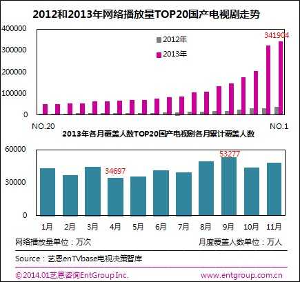 据艺恩enTVbase电视决策智库日播榜数据显示,2013年播放量TOP20电视剧播放量总和是2012年的8倍,腾讯视频和爱奇艺合计占据55%;同年1至11月TOP20国产电视剧覆盖人次累计超过3亿,9月突破5亿,视频网站凭借自身的优势不断刷新着网络收视记录。
