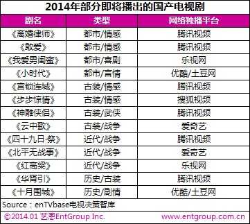 从2014年各视频网站发布的新年独播剧名单来看,视频网站将更加注重“大剧独播”策略,对重点剧集的独播将聚拢观众群体,形成网络播出内容的差异化。而现代都市、爱情、战争依然是三大主力类型。