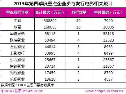 艺恩统计数据显示,2013年第四季度共有62家发行公司参与市场角逐,较去年同期增长7家。国营发行阵营中,中影凭借外片优势参与发行影片39部,累计票房30.9亿元,较第三季度下降12.1%。华夏凭借16部影片和16亿票房紧随其后。在民营发行阵营中,华谊兄弟凭借《私人订制》一片独大,占据单片票房排行首位,而就发行数量而言,万达影视本季度发行5部在民营企业中表现突出。