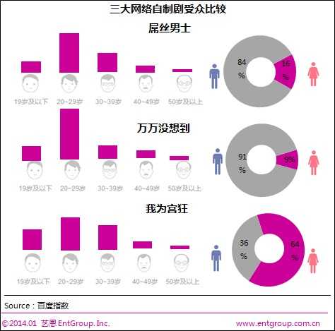2013年各视频网站都有网络自制剧问世,相比自制综艺节目在用户稳定方面意义重大,自制剧对平台影响力的提升更为显著。《屌丝男士2》《万万没想到》《我为宫狂》在2013年的网络自制剧中让人印象深刻。受众分布上三剧存在差异。
