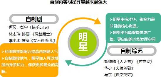 2013年网络自制内容的制作水准大幅度提升,自制内容开始提炼自身精英化气质。大明星、名主持加盟自制内容的现象越来越为常见,甚至可以与传统平台播放内容相媲美。自制内容与明星可以相互促进,实现共赢。