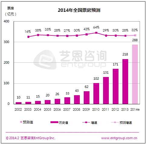 2014年春节七天电影票房斩获14亿,2月前25天票房突破30亿,截止目前,全国总票房超48亿,超过2008年全年票房。艺恩咨询结合数据分析和行业经验,分析显示2014年全国总票房增长将保持在30%以上,预计达到288亿,占北美票房(约合665亿人民币)四成份额。同时,在最新的全球版图上,中国的票房占比已超过10%,而北美则下降到不足1/3,未来中美消长的趋势仍将持续深化。