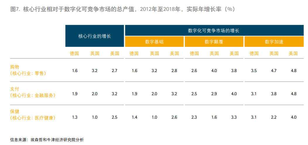 然而,数字化可竞争市场的规模到底有多大?发展速度是否比传统行业更快?对此,埃森哲与牛津经济研究院分析了德国、英国和美国三大经济体的数据,从购物(零售)、支付(金融服务)及保健(医疗保健)三个关键市场寻找答案。结果显示,数字化可竞争市场相较于其核心行业,将实现更高的增长率。