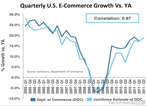 2011年12.15日美国数据统计和监测公司comScore 的数据图表,2011年底美国的电子商务发展已经恢复到了2007年底的水平,在2008年底左右到达低谷,当时因为全球性金融和经济危机所致。如下电子商务发展数据,浅色曲线是 comScore 的统计数据,数据图表制作是美国媒体SAI。