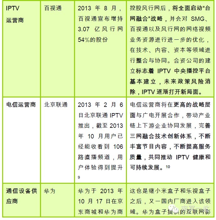 2013年开始,中国著名互联网公司、电信设备制造商、终端设备制造商、内容提供服务商等纷纷出手开始抢占客厅的最后一块屏幕——电视屏幕。8月,全球最大的IPTV供应商百视通宣布以3.07亿人民币增持风行网54%的股份,开始实施上海文广与风行网的“台网融合”战略;9月16日,百度推出互联网电视高清播放器——百度影棒,正式进军互联网电视多屏互动市场;乐视网、爱奇艺以及阿里巴巴等纷纷推出智能电视;小米公司、阿里公司陆续推出智能电视机顶盒;广电总局和电信运营商三网融合的进程也在层层推进。