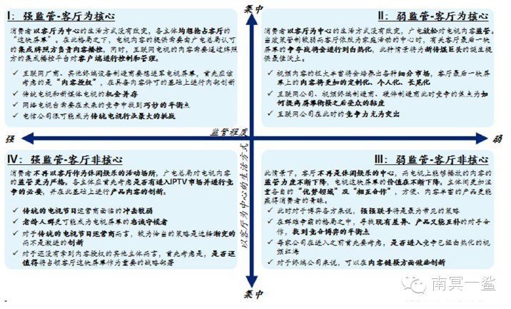 由于客厅最后一块屏幕的重要性更为突出,电视制造商、互联网厂商、电信运营商及各种终端设备制造商均会发力抢占客厅的这块屏幕。广电总局对电视节目内容监管严格,在内容提供方面具有优势。此时互联网厂商、其他终端设备制造商要想进军电视屏幕,首先应该考虑的是“内容授权”,在具备内容许可的基础上进行内部创新。