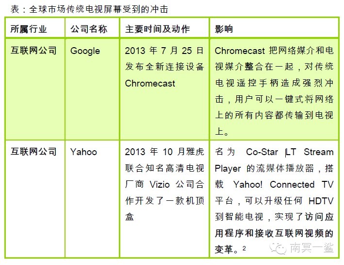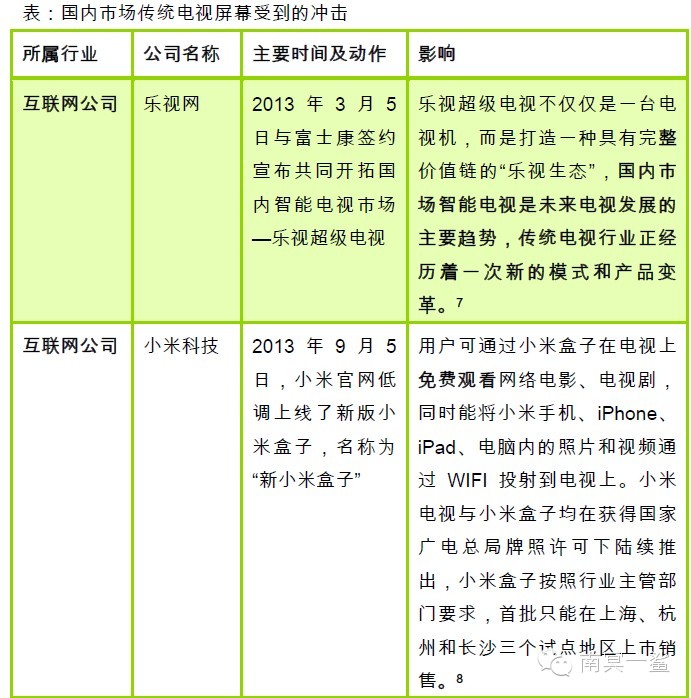 当政策管制较弱而客厅依然为家庭活动的中心时,有关客厅最后一块屏幕的争夺战将会到白热化。由于家庭活动围绕客厅展开,客厅最后一块屏幕的潜在价值将会不断上升。传统电视将会面临来自互联网电视的巨大的冲击。