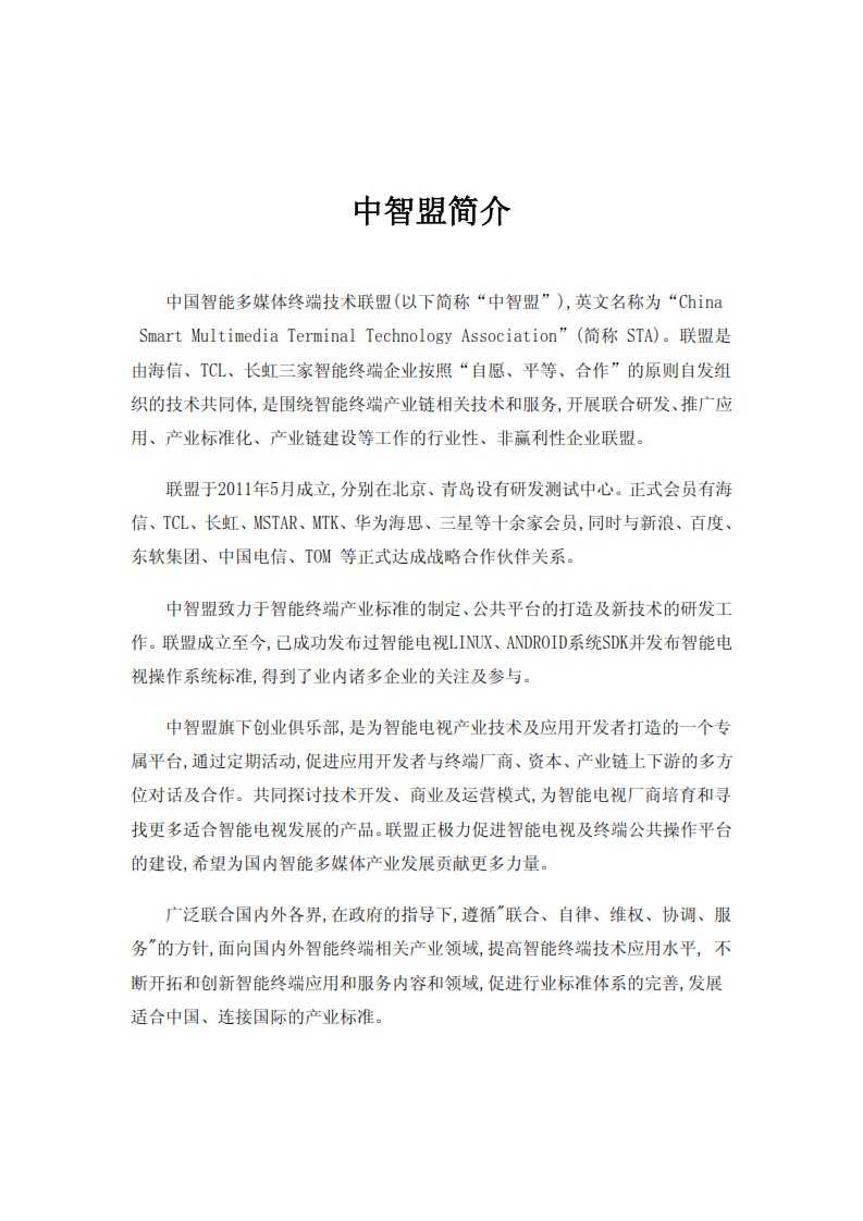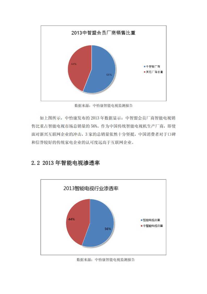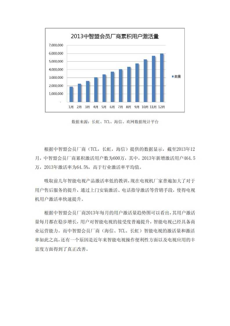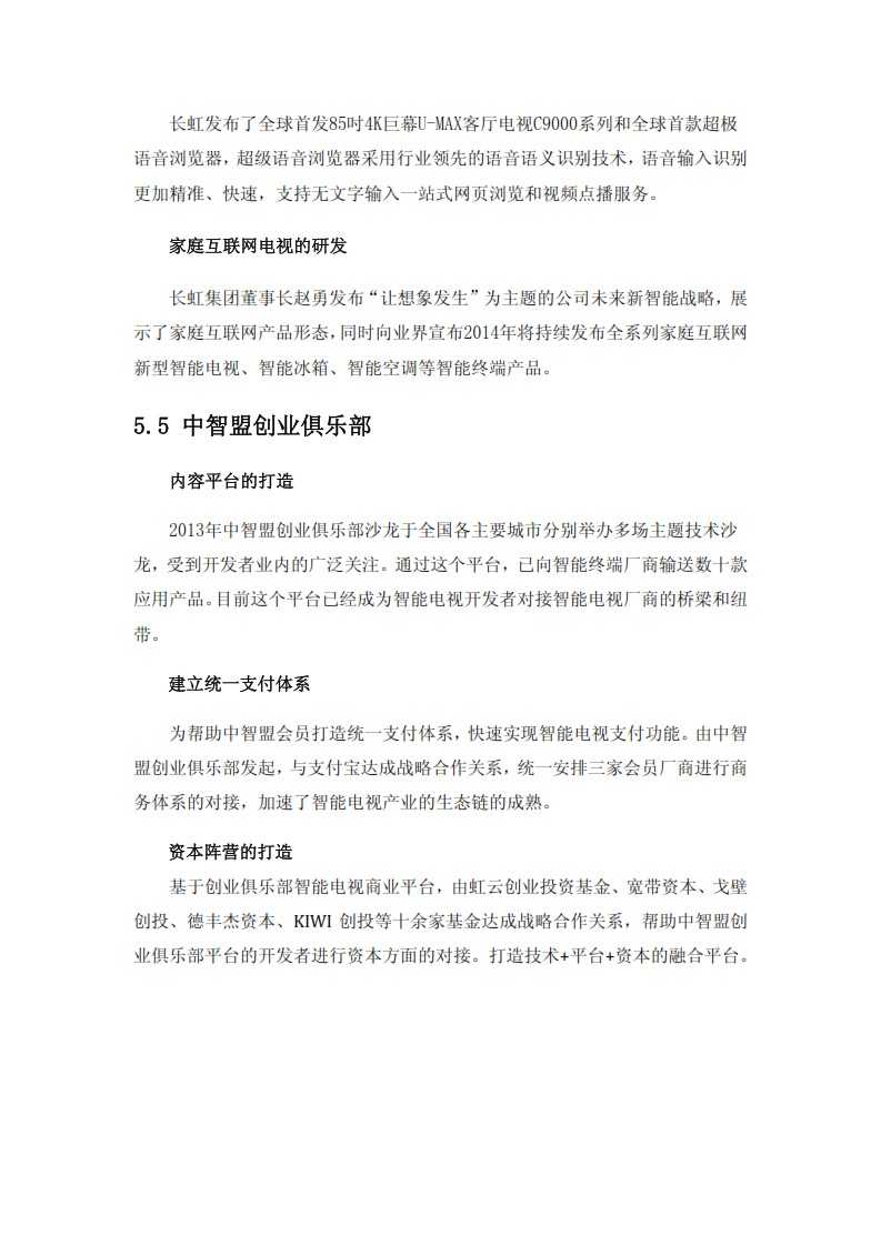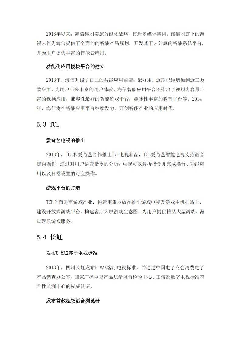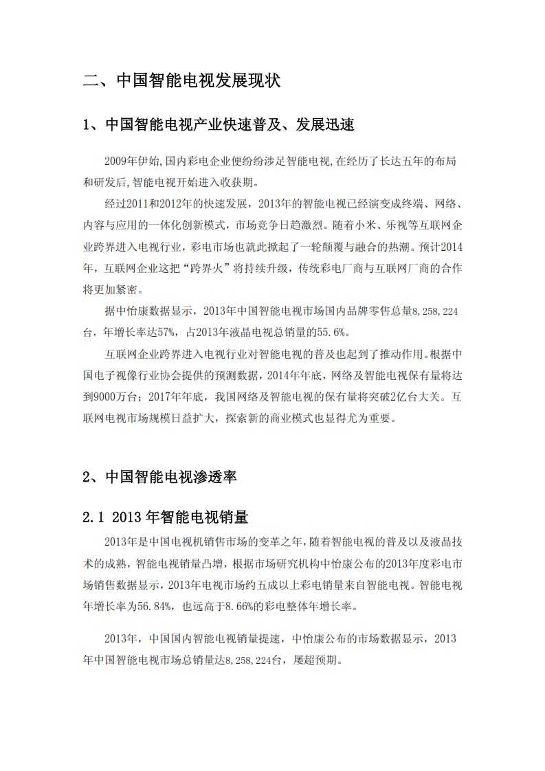 中智盟:2013年中国智能电视产业发展研究 更多阅读:中智盟:OTT智能电视行业广告标准白皮书中怡康:2014年1-4月中国智能电视渗透率达58.7%ZDC:2014年2月中国智能电视市场分析ZDC:2014年1月中国智能电视市场研究分析尼尔森:中国智能电视用户全样本收视行为及OTT广告价值研究酷鹅用户研究院:2018年中国智能电视用户洞察报告NDP:2012年Q2 中国40%的电视机出货带联网功能艺恩咨询:2014中国电影市场影响力研究志精科技&奥维咨询:2014年中国智能大屏媒介数据报告–智能电视篇Hub:2023年美国联网家庭报告Google智能电视设计规范J.D. Power:2014年中国汽车售后服务满意度研究迈点网:2014年7月中国酒店业高端品牌发展研究J.D. Power:2014年中国新车购买意向研究中国城市消费者研究:网络化生活方式正在形成