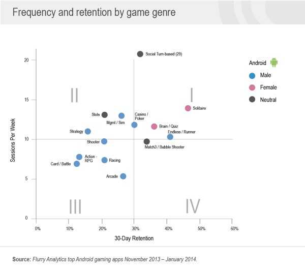 Flurry3月18日发表了一份关于Android游戏应用的调查报告。调查内容主要分两个部分。第一部分是关于游戏应用持续率(retention)和使用频率(session)。第二部分是关于全体用户中女性用户的比例和用户平均年龄。