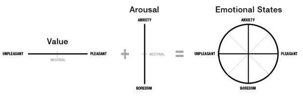 唤醒度是指身体、大脑或特定行为的无意识激活。人们使用焦虑(anxiety)对无聊(boredom)的水平来定义它;我们可以通过心跳速率、呼吸、血压和皮肤电来测量它。简言之,你可以将唤醒度看作是刺激或激活的水平。我们将情绪的两个维度(也就是,意识/认知和无意识/生理)结合,就得到情绪的环状模型。