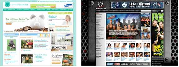 支配性的视觉特点可以描述为有棱有角的、直接的、冷酷的、暗色的、银色的、黑色的…并有一个厚重的基底。顺从的视觉特点可以描述为圆的、温暖的、明亮而清晰简明的、柔软而精美的、金色的。如果一种人格没有表现出明显的支配性的视觉或交互特征,人们倾向于认为它是更顺从的。图6的两个网站中,哪个网站更具支配性,哪个更加顺从?哪个是友好的,哪个不够友好?