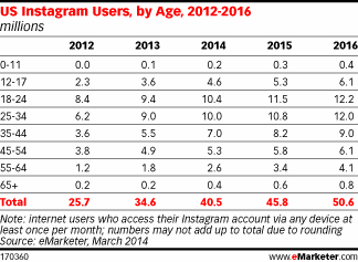 Instagram和Twitter的用户量非常相似。eMarketer预测去年有4320万美国消费者曾每月使用过Twitter——或17.6%的网民总量。同时,Instagram的用户占网民总量的16.1%。智能手机的Twitter用户数量就没这么多了,2013年Twitter智能手机用户仅有3080万;2014年将会增长至3730万,或22.7%的美国智能手机用户。对于Instagram这两个数字均有所微降,Instagrasm的活动几乎都发生在智能手机上(意味着Instagram的智能手机用户基础要比Twitter高),Instagram用户通过智能手机不用登陆就能获得网络账户。