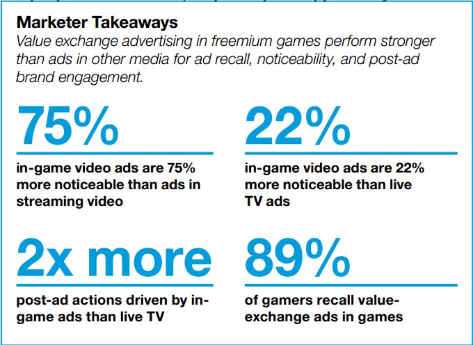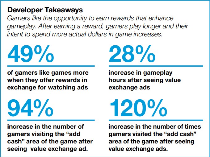 在同等价值交换上,89%的手机游戏玩家倾向于接受“价值交换式广告”。此外,手机游戏玩家在观看了“价值交换式广告”后,访问游戏内置“现金商店”的行为增加了120%。