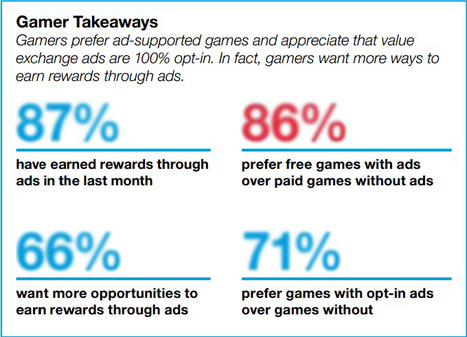 报告显示,86%的调查对象表示,比起付费下载且没有广告的游戏,他们更喜欢玩免费游戏,即使免费游戏中普遍包含大量广告和推送;79%的玩家称喜欢通过免费游戏中的广告获得奖励。