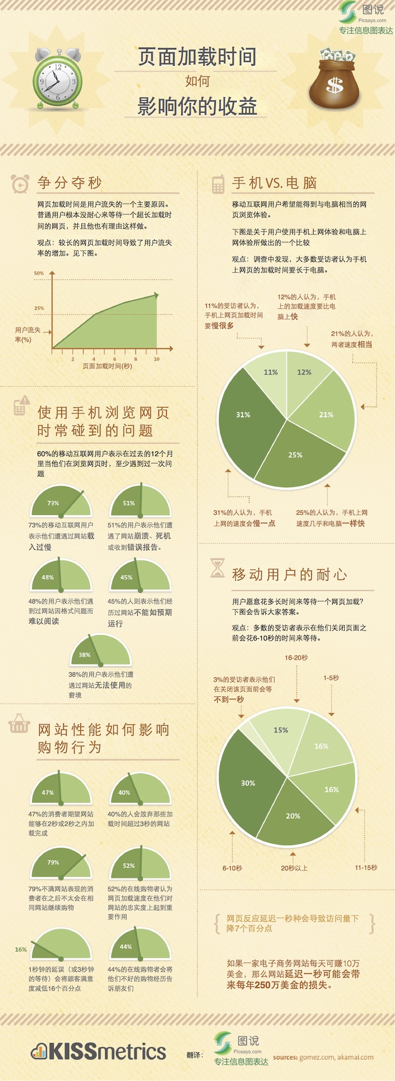 网页加载时间如何影响你的收益?—数据信息图 大家都知道网页打开时间上有一个8秒原则,就是在等待网页加载8秒之后,用户将失去耐心,从而停止浏览该页面。8秒并不是准确的8秒钟,只是向网站方表明了加载时间的重要性。那么来到移动互联网时代,网站的加载时间又是如何影响用户行为的呢?对于一个日收益10万的网站来说,网页每延迟一秒钟就有可能带来每年250万美元的收益! 更多阅读:用户体验的那些事儿–信息图什么是用户体验?–信息图Adobe:从内容管理到用户体验管理一张图科普什么是用户体验!–信息图Conviva:缓冲是视频网站的噩梦关于用户体验的三个反思Econsultancy:导航和屏幕问题制约移动网站体验拉近用户体验的距离kissmetrics:用户离开网站的8个原因信息图:网速就是一切分析:为什么自由软件的用户体验差Temkin:用户满意是一切微众银行:2020银行业用户体验大调研报告Tealeaf:美国电子商务网站用户体验改进现状2017年用户体验行业调查报告