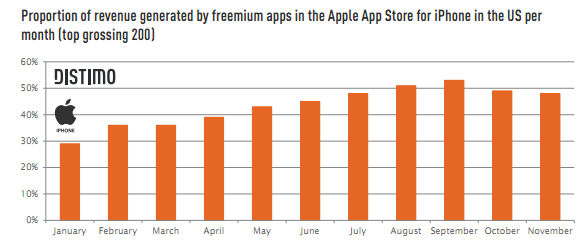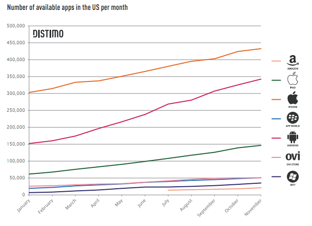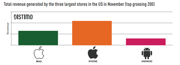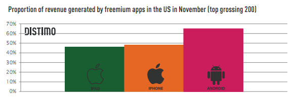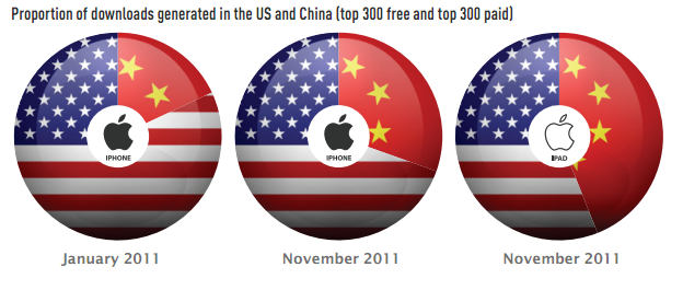 Distimo:2011年移动APP商店报告关键数据分享 Distimo发布了2011年的移动APP商店报告,下面我们来看报告里面的关键部分: 1、各商店的应用数量高速增长 2、免费APP+应用内付费模式成长快,占据主导,超越付费下载模式,安卓市场免费模式创收比例最高 图:苹果应用商店中免费模式创收比例变化 图:不同应用商店,免费应用模式创收所占据的比例 安卓更高一些 3、iPhone商店收入最高,iPad市场收入是安卓市场的2倍 图:不同应用商店的收入对比 4、中国成最大的APP下载市场 更多阅读:Distimo:Windows Phone7应用商店发展情况,落后如何追赶Distimo:至2012年1月亚马逊应用商店相关数据distimo:应用商店的商机ABI:移动APP应用内购买的未来Distimo:iPad应用商店数据回顾Distimo:安卓应用商店应用数量破40万Compuware:85%的用户喜欢移动APP胜于移动网页VisionMobile:哪种App更赚钱Shoutem:移动APP商店发展历史零售商转向移动app来促进销售appannie:应用商店之争,Google play崛起,苹果蛋糕最大Flurry:游戏主导移动APP 独立开发商占主导New Relic:数据中的移动互联网VisionMobile:开发什么APP最赚钱Swrve:APP的60秒定律
