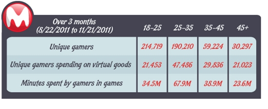 移动游戏社区MocoSpace周二发布了该社区就购买网络游戏虚拟道具的调查分析报告。该报告显示尽管年轻玩家(年龄介于25岁到35岁之间)往往会花费大量的时间来玩社交游戏,但是真正花现金去购买其中虚拟道具的中坚力量却是年龄在45岁以上的老玩家。该数据是基于对MocoSpace的2200万用户中的50万名用户随机调查的结果分析得出的。