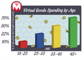 根据MocoSpace的报道,玩家的年龄大小和他们在游戏当中购买虚拟道具的费用多少成正比分布。玩家的年龄越大,他们花费在虚拟道具上的资金就越多。尽管年龄在35岁以上的玩家只占据了本次调研总人数的18%,但是他们的虚拟道具开销则占据了调查总额的42%。于此相对的,年龄介于18岁到25岁之间的玩家占据了调研总人数的43%,但是他们的虚拟道具开销则仅占了总额的18%。