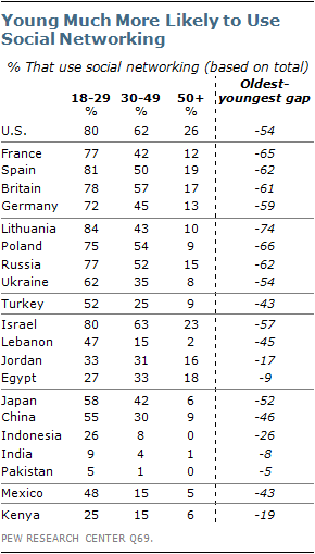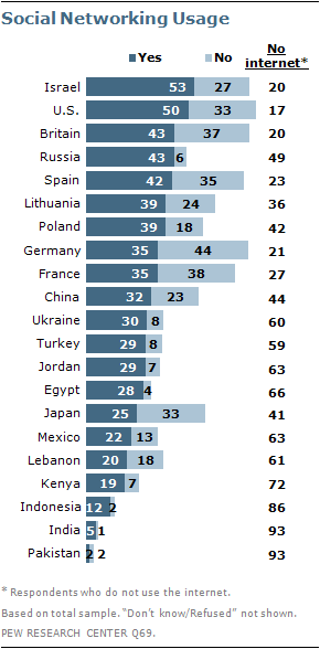 调查还发现社交网络在很多国家都变得非常流行,以色列53%的用户使用社交网络,美国为50%,英国、俄国和西班牙分别为43%、43%和42%。
