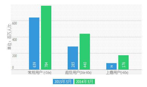 下表显现出所有用户使用他们的手机和应用程度的年增长水平。我们发现用户“手机上瘾”的情况正在变得越来越严重:手机上瘾用户,每天开启应用超过 60 次的人,从 2013 年 3 月的 7900 万人,增长到了今年 3 月的 1.76 亿人,涨幅达到了惊人的 123%……常规用户每天打开应用低于 16 次,增长了 23%;超级用户每天打开 16-60 次饮用,人数则增长了 55%。