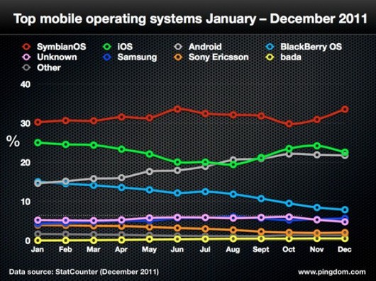 Pingdom:2011年Symbian全球市场份额增长至33.52% 2011年12月31日分析机构Pingdom发布的最新数据显示,2011年,Symbian市场份额从年初的30.25%增长至33.52%,增长主要来自印度、非洲和南美市场。在这些地区,双卡双待(dual-SIM)、低价手机非常畅销。 2011年Symbian系统市场份额仍在增长 另一方面,在2011年1月至12月间,Android份额增长也很快,从14.6%增长至21.7%。苹果iOS份额过于一年走势平稳,仍是Android最大竞争对手,市场份额达22.63%。 更多阅读:asymco:2011年全球智能手机市场份额有米广告:2011年上半年中国移动互联网广告数据报告SimplyHired:2012年2月移动开发行业趋势2012年全球手机出货量为17亿部 其中运行Android、iOS、Symbian、黑莓和WP手机出货量为7亿VisionMobile:移动平台生态系统研究报告comScore:2011年7月Android在欧洲份额已超过iOS 第一仍为Symbian有道词典:数据显示英语水平最高的人群主要分布于东部沿海地区Pingdom:社交网络挽歌响起 用户一走就不再回头Pingdom:全球排名前1万的网站中有24%使用了Facebook 的官方插件Pingdom:2011年全球Facebook使用率排行榜Pingdom:数据显示苹果iPad占全球平板电脑互联网流量85.7%Pingdom:调査显示在全球开源软件的使用率高达75%RichRelevance:2011年美国移动商务市场iOS市场份额达92%comScore:2011年9月加拿大智能手机市场份额 Android占25%Nielsen:2011年Q3 43%的美国人拥有智能手机 Android市场份额为43%