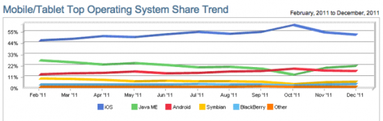 根据互联网市场数据供应商Net Market Share提供的整月数据显示,iPhone和iPad用户已经成为了使用移动互联网用户的主力军。在2011年12月,iOS用户占据了移动互联网市场流量的52%,即在上个月里,超过一半的移动互联网接入都是通过iOS设备来完成的。