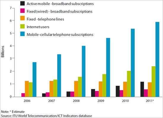 据国外媒体报道,联合国国际电信联盟(ITU)日前发布的最新统计报告显示,截至2011年年底,全球手机用户总量已达59亿。考虑到全球人口总量为70亿,而59亿的手机用户量数据,说明移动通信已深入到全球公众的日常生活当中。ITU报告还显示,从整体上看,全球移动通信渗透率已达87%,所有发展中国家的渗透率也高达79%。在全球所有手机用户中,移动宽带用户将近12亿。过去四年中,全球移动宽带用户量每年增长45%。截至目前,全球移动宽带用户量与固话宽带用户量比率已达到2:1。