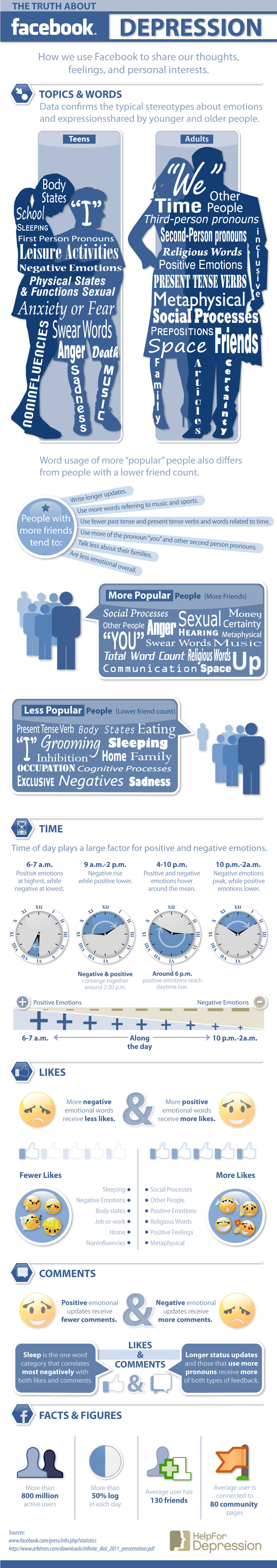 Help for Depression 信息视图反映了我们如何使用Facebook来分享我们的感受。Facebook用户的状态更新在早上6-7点最积极,随着时间的增加而渐趋负面。而正面的状态更新能够获得更多的“赞”,负面的更新则会收到更多的评论。